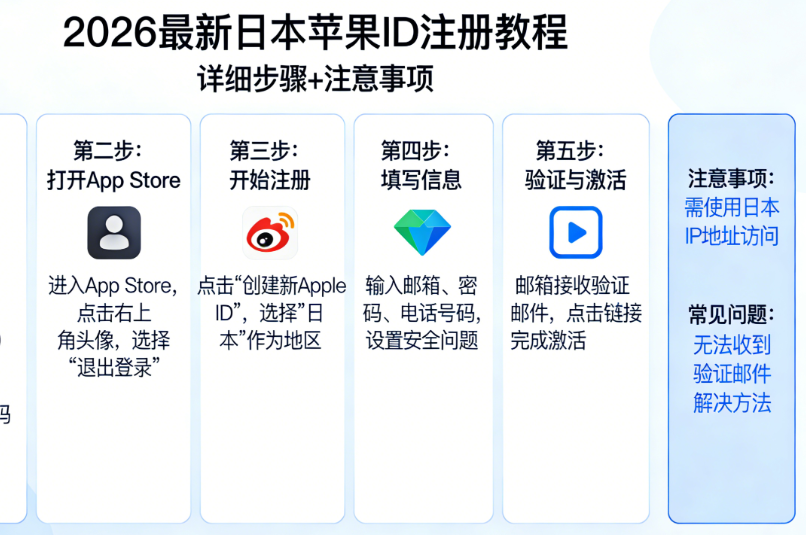 - Q2:注册后无法下载应用? A:先确认App Store已切换为日本区(界面为日语),若未切换,退出日本苹果ID重新登录,或在App Store设置中手动切换地区为日本,切换后即可正常下载;若仍无法下载,检查网络是否稳定,重新登录账号尝试,或重启设备,基本都能解决;